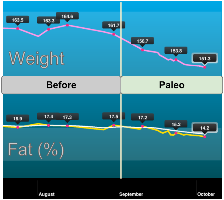 Beginning September 2nd, I began eating a Paleo diet. Most of my meals were home cooked recipes from the Everyday Paleo cookbook. When eating out, I did my best to choose Paleo-friendly menu items.