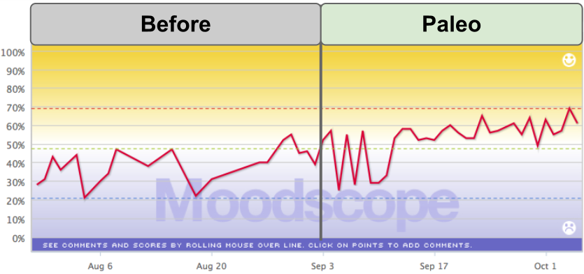 In Everyday Paleo, the author recommended trying the Paleo diet for 30 days and then deciding whether to continue eating Paleo if you feel more alive and energetic. If not, you can always go back to eating the way you were before. Well, there’s no question that I feel better. I’m especially glad that I diligently measured my mood every day—looking at the graph is much more compelling than simply explaining how I remember feeling.